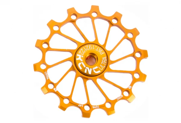 Galet de dérailleur usinée en Aluminium AL7075 a dents longues et étroites/larges pour 11/12v et un meilleur guidage de la chaIne.Roulement en acier inoxydable.Utilisation. Route et VTT.Compatible avec: Sram, Shimano et Campagnolo .Vitesses: 9, 10, 11 vitesses (Shimano et Campagnolo) et 9, 10, 11, 12 vitesses (Sram).Quantité: 1 Galet.Couleur: Or.Dents: 16 Dents.Poids: 11 gr.